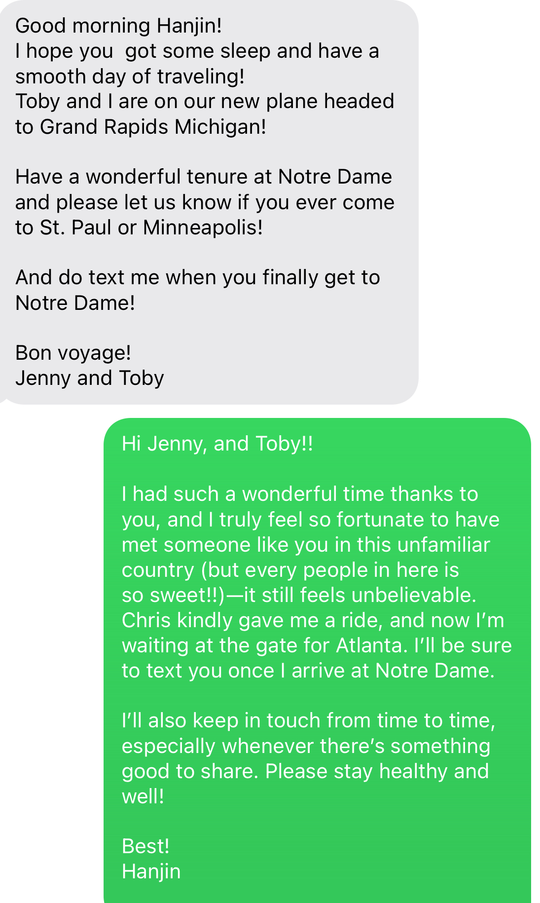 아참, 그리고 Jenny는 끝까지 나를 걱정해줬고, 노터데임에 도착하고 또 연락을 드렸다. 나도 이렇게 도움을 줄 수 있는 큰 사람이고 싶었다.