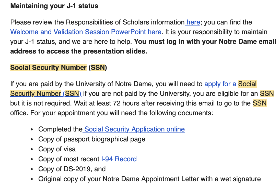 학교에 나의 도착을 알리고 나니, 이민국에서 다음과 같은 메일을 보내며 빠른 시일 내로 SSN을 발급 받아야함을 알려주었고, 필요한 서류 리스트들을 다음과 같이 안내했다.