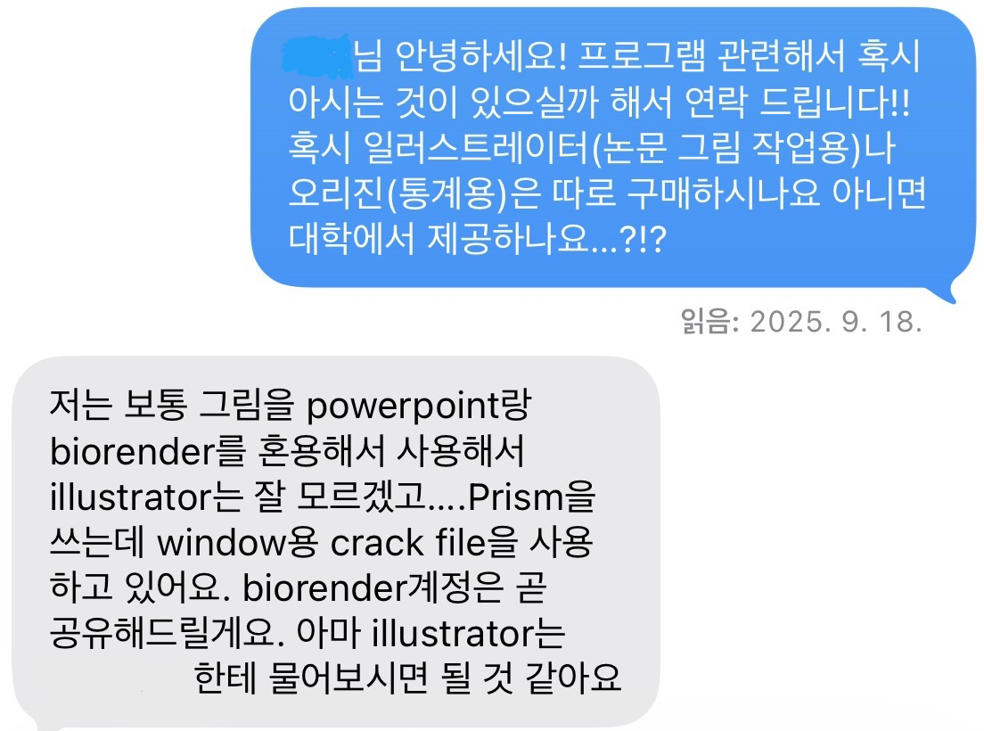 나는 실험 데이터를 정리하고 프레젠테이션 자료를 준비하거나 논문 내에 실을 그림(Figure)을 그릴 때 보통 어도비 일러스트레이터를 자주 사용하는데, 내가 포항에 있을 당시에는 학교에서 일러스트레이터 구독권을 구매해서 학생들이 무료로 사용할 수 있게끔 해주었다. 데이터를 통계처리 하거나 그래프를 따로 그려야 할 경우에는 오리진(Origin)을 사용했고... 사실 연구자들에게 당연하게 제공해야할 무언가는 아니지만 학교 차원에서 일종의 복지 또는 배려로 제공하는 개념이었기에 혹시나 이 학교도 그러려나 하여 찾아봤는데 딱히 생산적인 답변을 얻을 순 없었다.