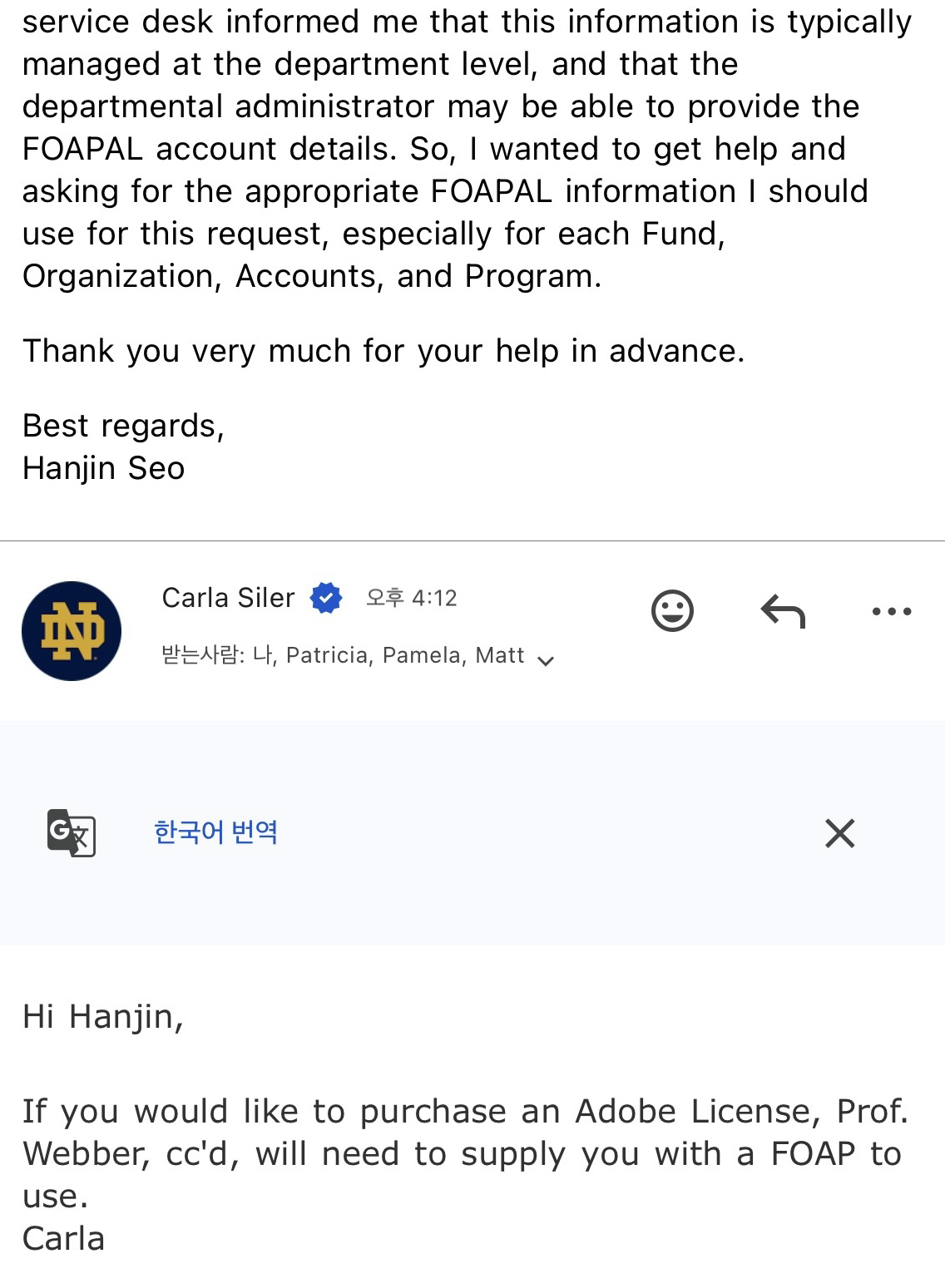 학교 내 IT서비스 팀은 부서차원에 문의하라고 했기에, 이 대학 화공과 스태프에게 메일을 돌리니, 담당자가 어도비 라이센스가 필요하면 "FOAPAL"을 통해 구매해야 한다며 교수를 참조해 메일을 보냈는데,