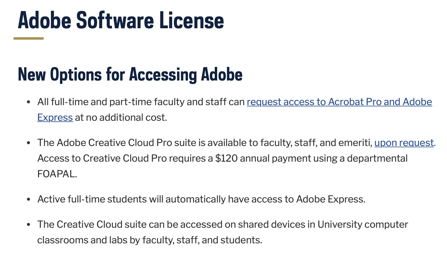 교내 홈페이지를 들쑤시다 보니, 위의 안내문을 발견하게 되었다. 즉, 뭔지는 모르겠지만, "부서 차원의 'FOAPAL'(?)"을 통해 1년에 120 달러를 지불하면 어도비 크리에이티브 클라우드 프로 (일러스트레이터, 포토샵 등이 포함된 프로그램)을 사용할 수 있다는 것이었다. 애초에 어도비 중에서도 "일러스트레이터" 한 개의 한 달 구독권이 23달러이기 때문에, 1년 120달러로 저 크리에이티브를 사용할 수 있다면 나한테도 이득이었다. 즉, 사비로 결제할 의향이 있기도 하고 (애초에 학교에서 구독권을 학생마다 챙겨줄 거란 기대도 안했음), 정말 모르겠는 저 FOAPAL의 정체를 파악하는 것이 먼저라고 생각이 들었다.