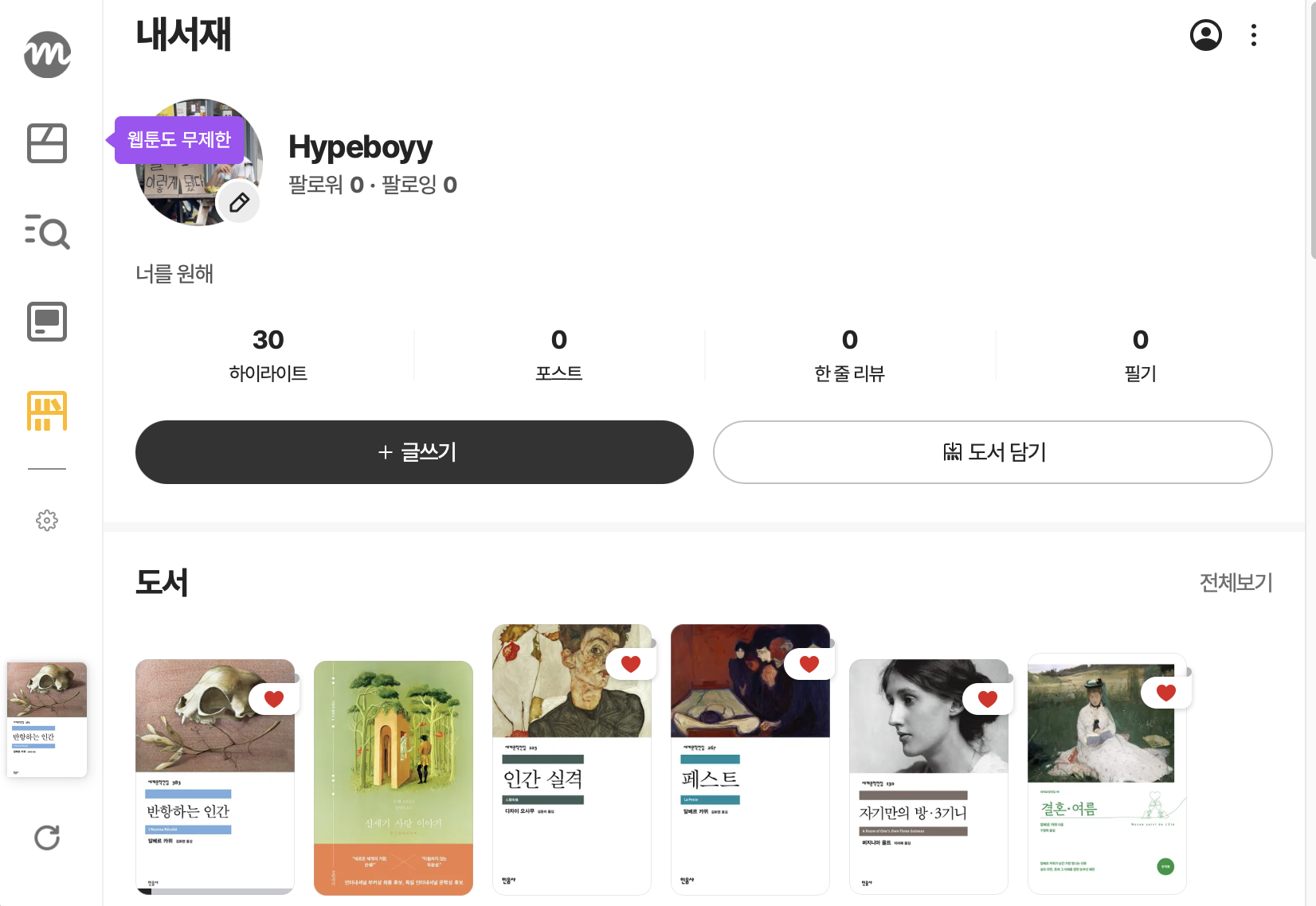 종이책이 너무 비싸서(한국어 버전), 밀리의 서재를 구독하기 시작했다.