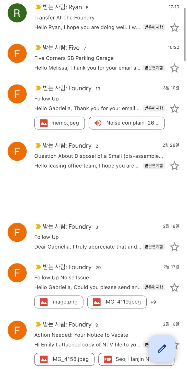 1월 10일부터 메일을 보냈는데, 윗 집에 사람이 없다는 개빡치는 말 부터 시작해서 (결국 사람이 있는데 자기들이 체크하지 못한 거였음), 자기들이 notification을 하겠다고 했지만 이를 행하지 않았다는 사실, 그리고 이들을 처리하는 느린 메일 처리 속도때문에 정신이 나갈 뻔 했다. 실질적으로 내가 이사한 날은 3월 17일 이었으니, 2달 하고도 1주일을 정신병 직전의 상황에 놓였던 것이다.